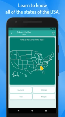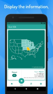 To get to know the USA states, simply select the learning mode and click on the map of the USA to view the details of the state, including the region in which it is located, its abbreviation, capital, area of the state and its population.