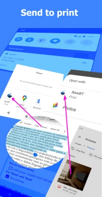 Find menu items "print", "share", "send" or "open" in any app, click and select RawBT.